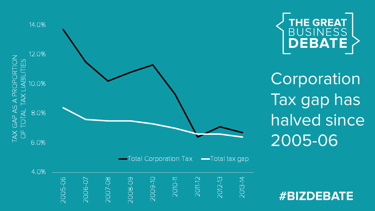 In a recent survey that Ipsos MORI conducted for the CBI, 55% of the public said that they thought that the Corporate Tax Gap has been increasing, yet the scale of business tax avoidance has been falling for the last 10 years. The Corporation Tax gap[1] has halved from 14% in 2005-06 to 7% in 2013–14.